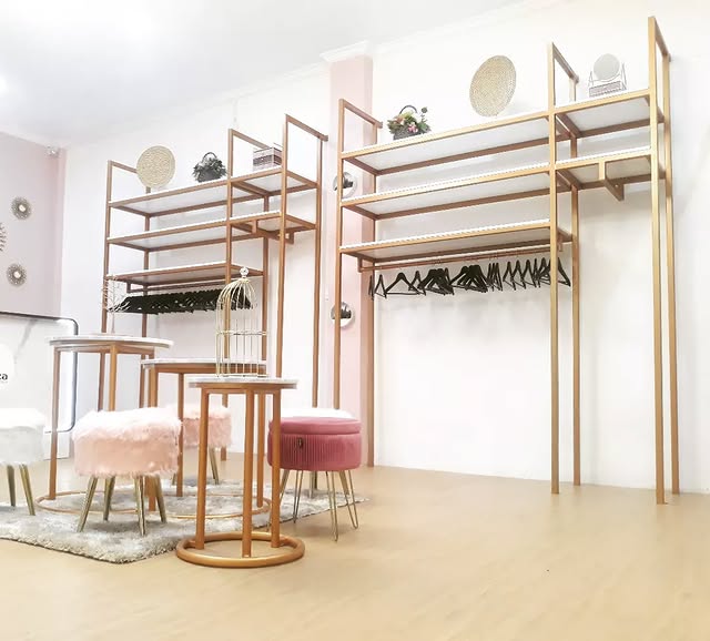Bahan: kayu, kaca, dan metal, dengan fokus pada kualitas dan detail pengerjaan.